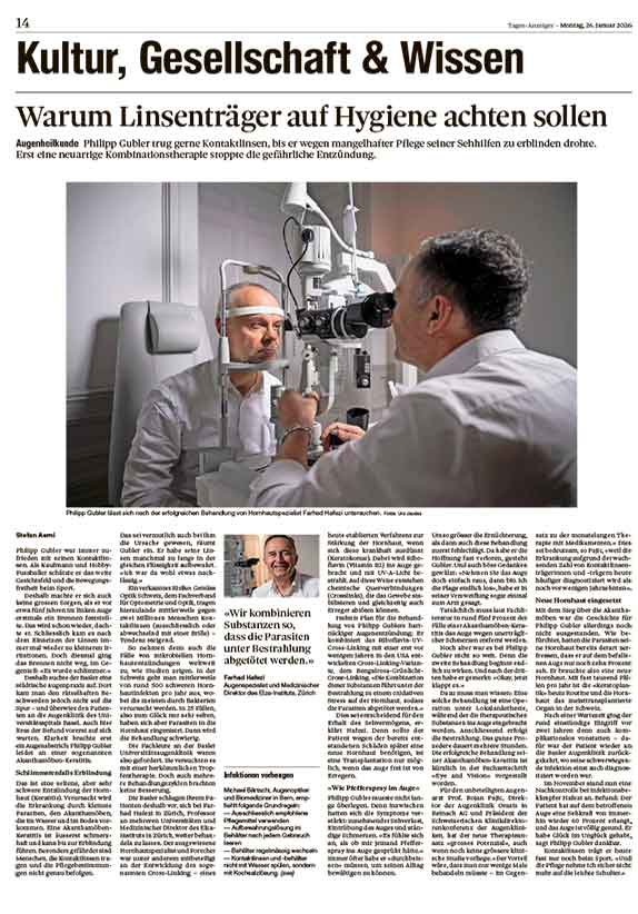 Today, TA Media published an in-depth report on the risks associated with contact lens wear and the clinical challenge of Acanthamoeba keratitis across its leading Swiss newspapers, including Tages-Anzeiger, Der BundBasler Zeitung, and Berner Zeitung. Written by health journalist Stefan Aerni, the article brings national attention to a rare but potentially blinding corneal infection and highlights an innovative therapeutic approach developed in Zurich.