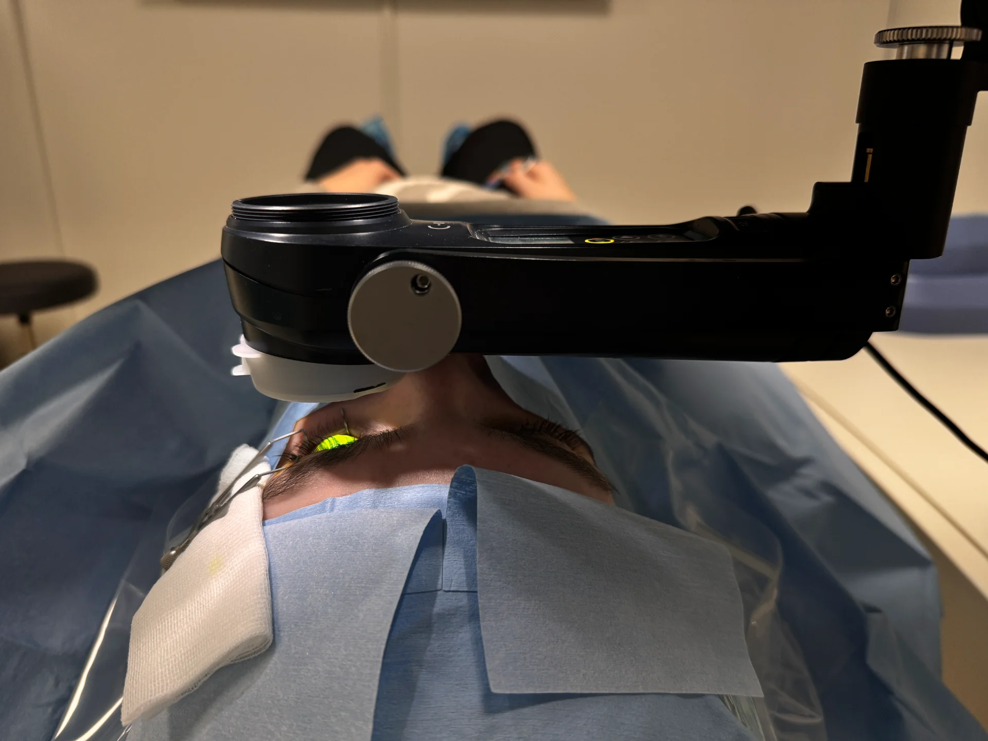 The eyes are held open by a lid speculum. This is perhaps unusual for patients to experience, but causes no pain.