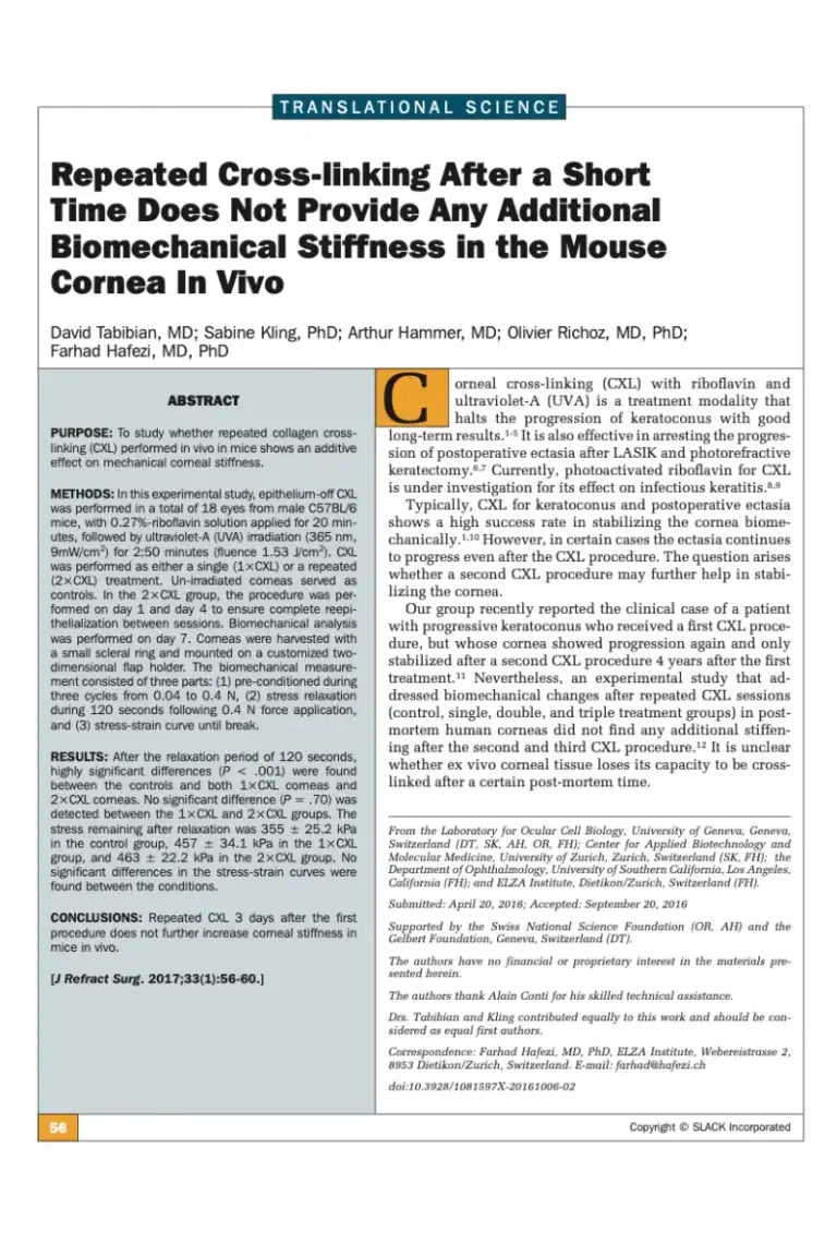 In a lab study, we were able to show that repeated cross-linking within a week does not improve corneal biomechanics. However, we know that in reality there are often months and sometimes years between the first cross-linking and the repeat procedure.