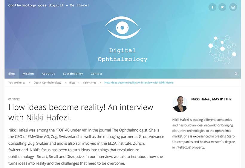Dr. Sebastian Siebelman from the media outlet, “Digital Ophthalmology” interviews ELZA AG’s Chief Executive Officer, Nikki Hafezi, as part of their “Visionaries” series.