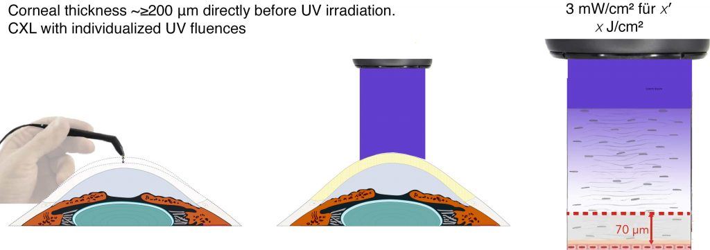 This model, now integrated into the EMAGine C-eye device, allows safe cross-linking in corneas as thin as 200 µm. The protocol, termed ELZA-sub400, has now reached its second generation. Clinical results show an 82% stabilization rate at 2 years, even in corneas with Kmax >90 D and stromal thickness <300 µm. Importantly, endothelial cell density remains unaffected when using appropriately titrated fluence.