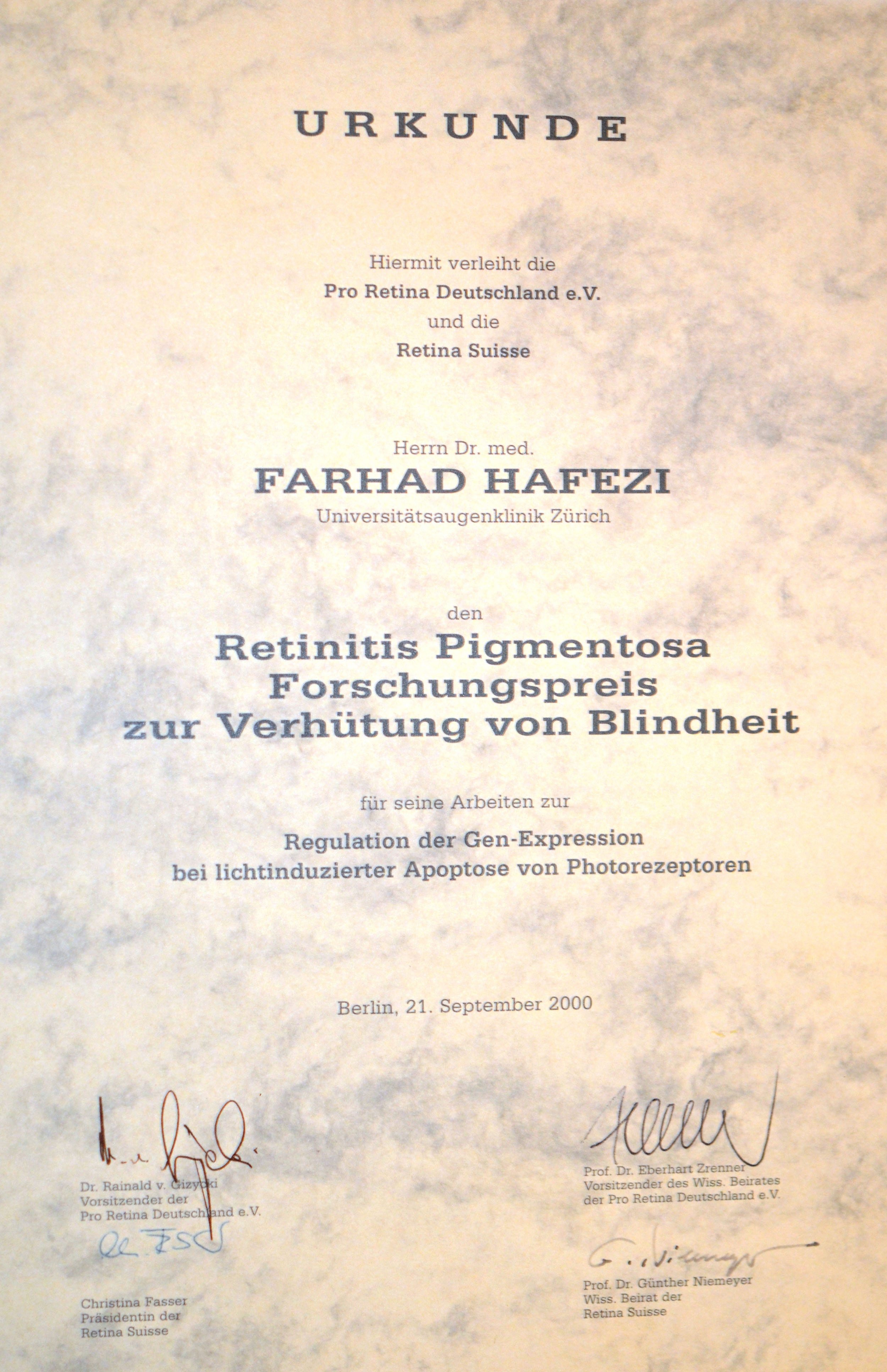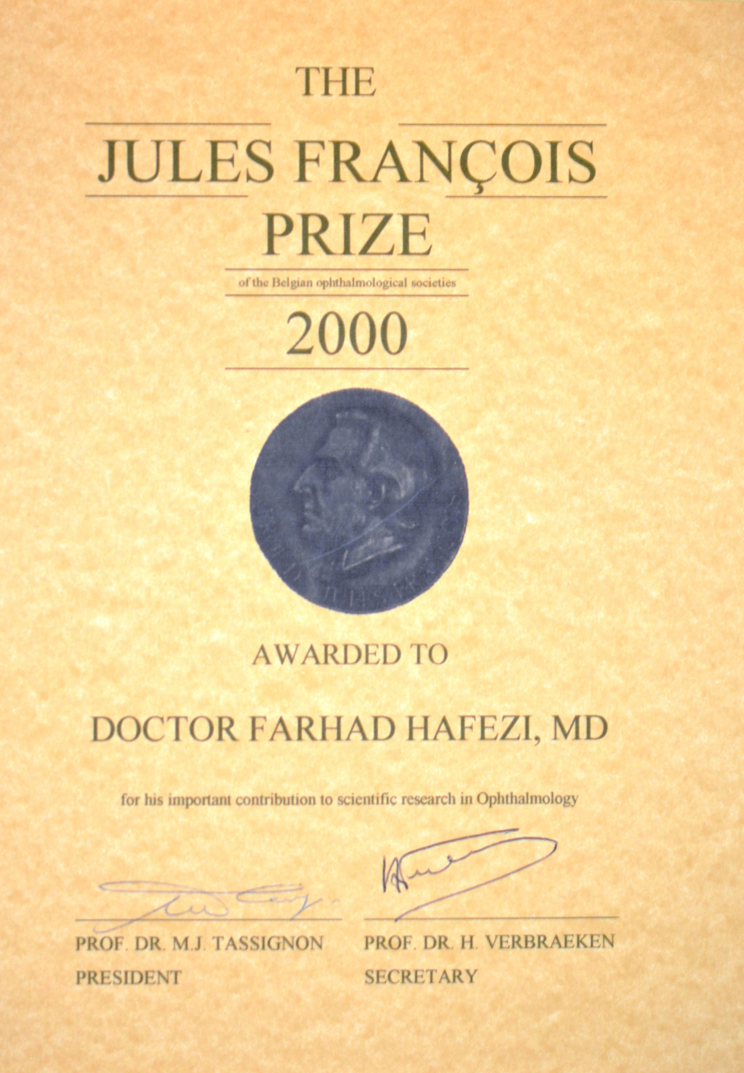 Highest ophthalmological award in Belgium, awarded to Farhad Hafezi for his work on retinal degeneration.
