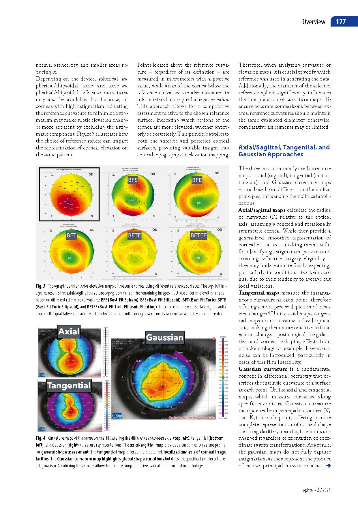 The article also clarifies the often-confused relationship between curvature and elevation. Although they describe the same corneal surface, elevation maps depend on the chosen reference shape, such as a best-fit sphere or ellipsoid. Changes in reference diameter or geometry can significantly alter map appearance, underlining the importance of consistency when monitoring patients over time.