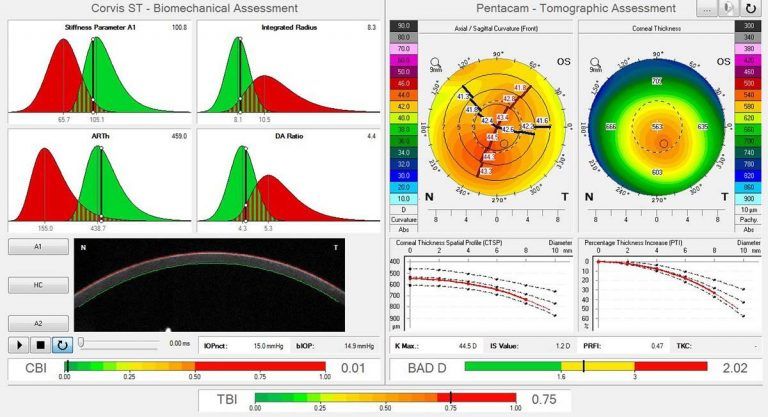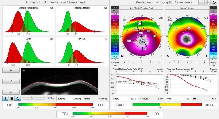 A 56-year-old family man with bilateral keratoconus. His three children do not wear glasses and have good eyesight (according to their parents). During the screening, the 17-year-old son showed a previously undiscovered grade I keratoconus in the left eye. The right eye was suspicious, but not yet obviously ill.
