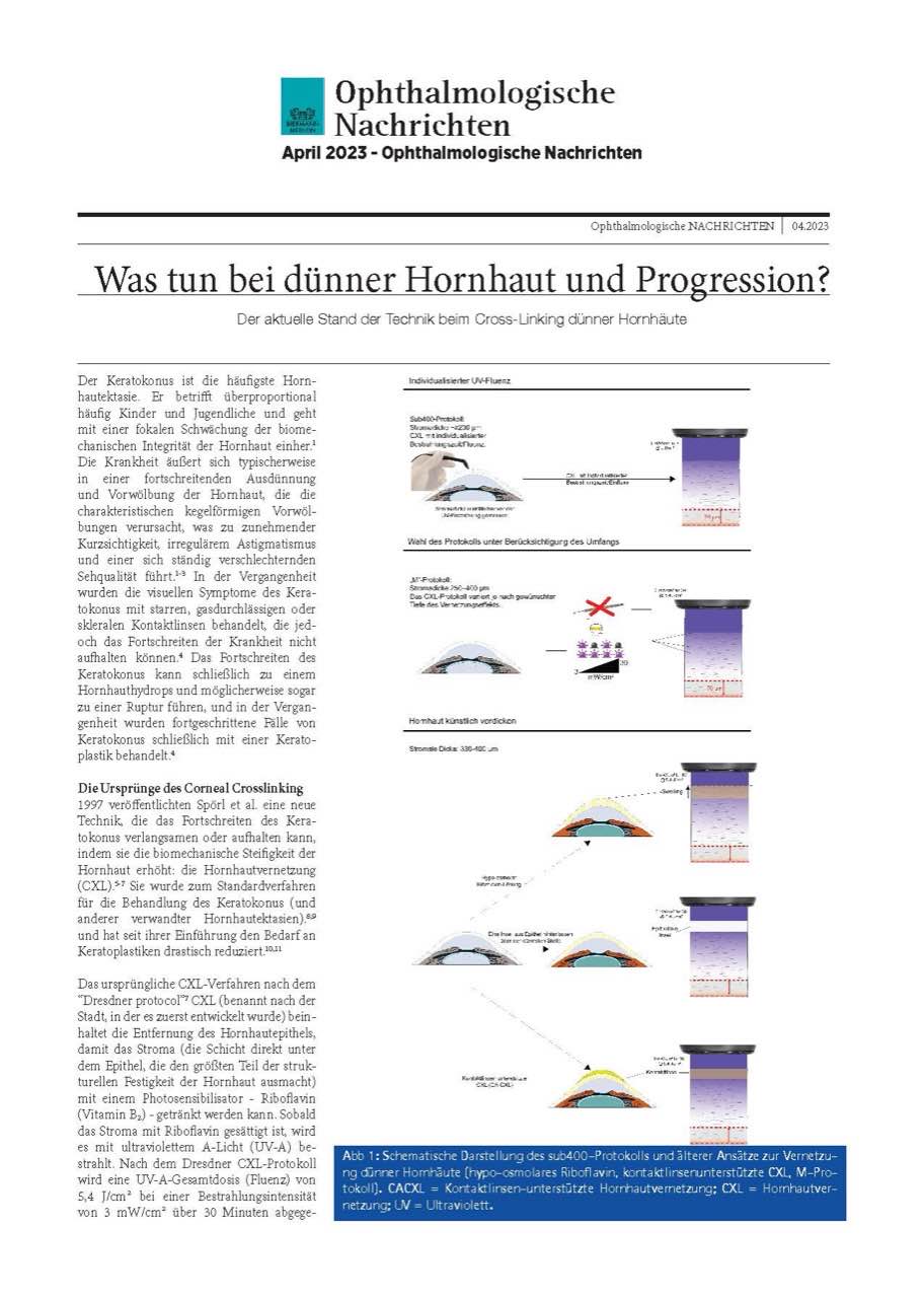 A recently published article in Ophthalmologische Nachrichten reviewed the current state of corneal cross-linking (CXL) in patients with progressive keratoconus and thin or ultra-thin corneas—a group historically excluded from standard treatment protocols. The review, authored by ELZA’s medical director, Prof. Farhad Hafezi, MD, PhD, FARVO, addresses a long-standing clinical challenge: how to safely stabilize ectatic progression when stromal thickness falls below the conventional 400 µm threshold required by the Dresden protocol.