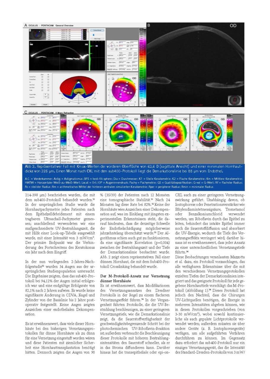 Clinical data summarized in the review report high rates of tomographic stability in thin and ultra-thin corneas, including eyes with stromal thicknesses well below 400 µm. Follow-up data extending to two years show sustained stabilization without evidence of endothelial decompensation, and a correlation between irradiation time and demarcation line depth supports the predictability of this individualized approach.