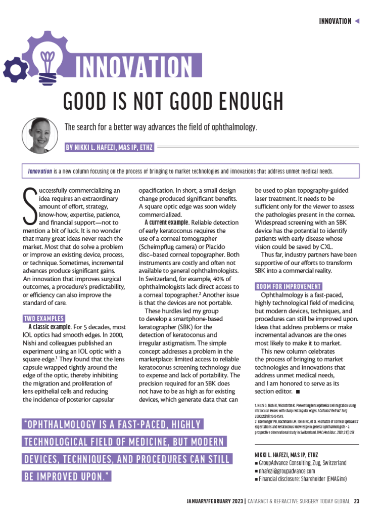 Nikki Hafezi MAS IP ETHZ, the CEO of the ELZA Institute in Zurich, continues to drive innovation in the field of ophthalmology. As the newly appointed section editor for Cataract and Refractive Surgery Today, she recently published an insightful article titled “Good is not Good Enough,” emphasizing the importance of pushing beyond the status quo in ophthalmic technology.