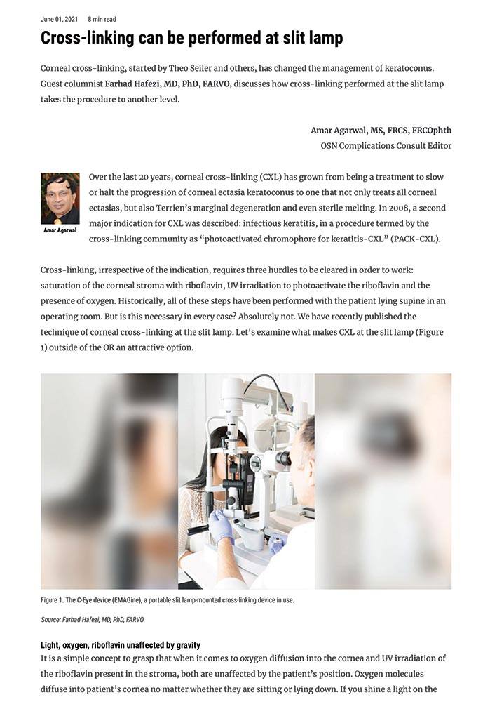 Prof. Amar Agarwal, editor of Ocular Surgery News, reports on corneal cross-linking at the slit lamp together with Prof. Farhad Hafezi. See the link here.