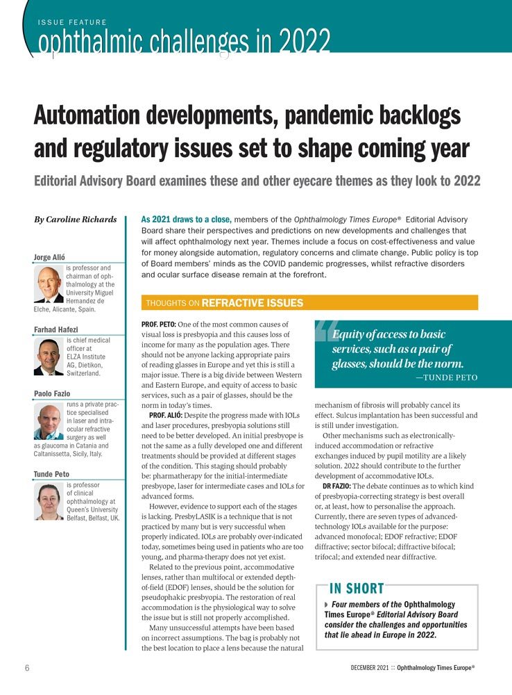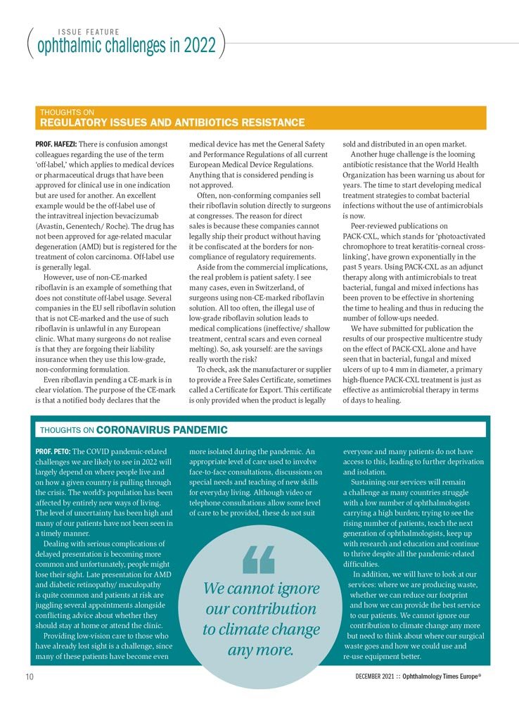 Prof. Hafezi, as a member of Ophthalmology Time’s Editorial Advisory Board, for his opinions on the “developments and challenges that will affect Ophthalmology in 2022” in OT’s “Ophthalmic Challenges in 2022” issue. Prof. Hafezi discussed everything from Artificial Intelligence to antibiotic resistance, and in addition, covered the topics that included corneal cross-linking and ocular surface disease.