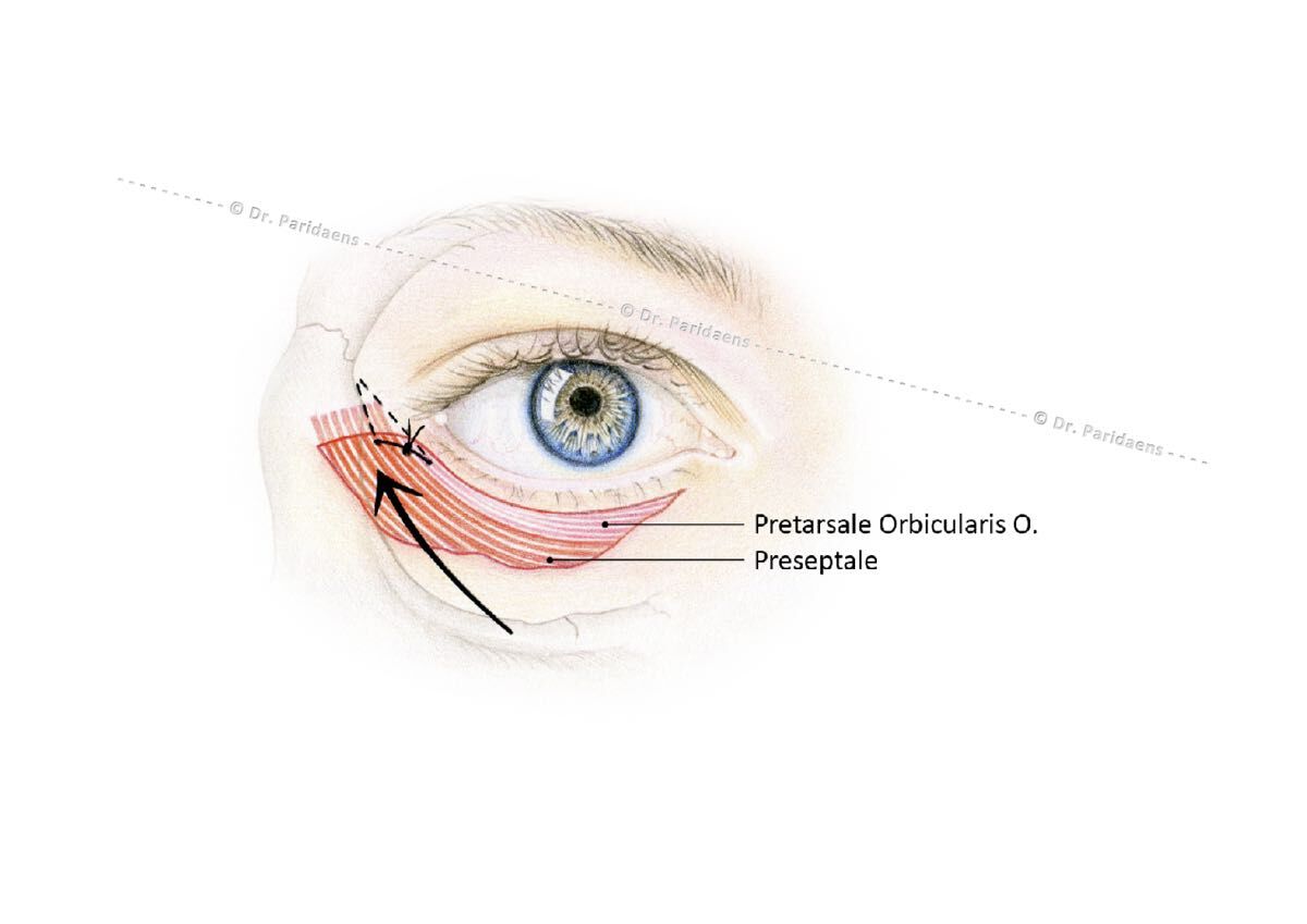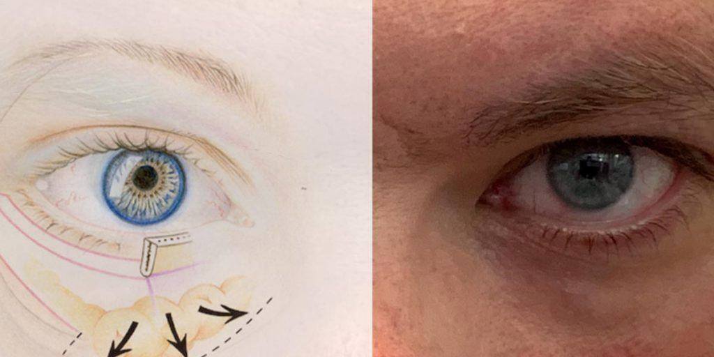 If there is horizontal sagging of the lower eyelids with an excess of skin and fat, I usually opt for a lower eyelid correction, whereby access to the connective tissue bulkhead is obtained via a cut in the skin, a few millimetres below the eyelash edge. After this, the connective tissue shot can be ‘fed’, whereby the fat is brought back into the eye socket, where it functions as a ‘shock absorber’ for the eye. The fat can also be redistributed over the rim of the eye if there was a filling defect there (Loeb-Hamra technique). Rarely does fat really have to be removed. What is critical for the success of this technique is that the eyelid on the side is fixed to the bone, otherwise a poor-functioning and cosmetically disturbing droop will arise. This so-called canthopexy is an operation that many surgeons find difficult to perform. That is why such an operation is best performed by a surgeon who is experienced with lower eyelid surgery and often performs canthopexy.