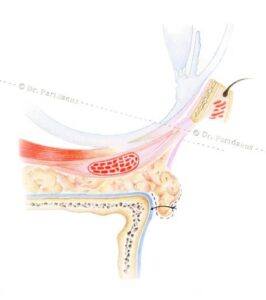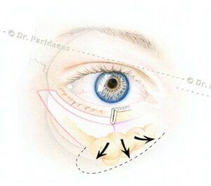 The excess fat in the lower eyelids is used to fill the hollow groove. Here you can see how the fat apron is fixed to the peritoneum (blue) under the lower eye socket edge. This means that filler injection is no longer required!