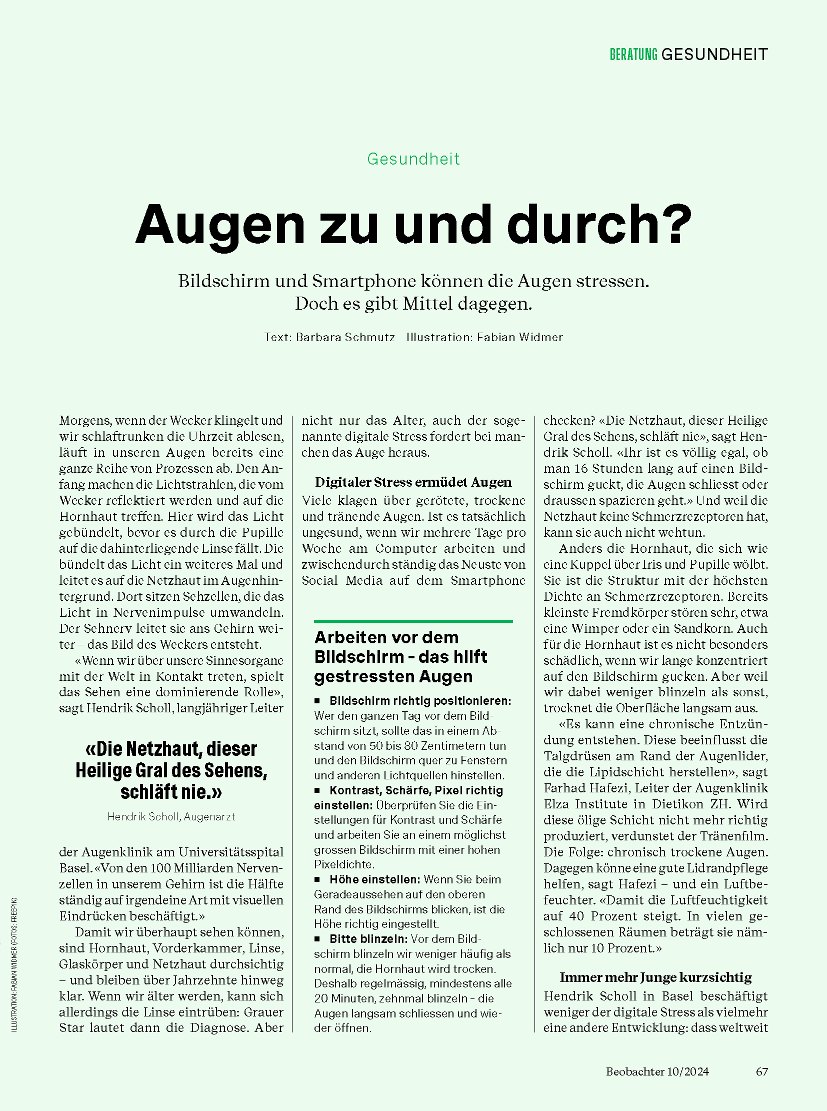 Digital devices dominate modern daily life, raising persistent concerns about their impact on eye health. An article published in Beobachter (10/2024) examines what happens in the eye during prolonged screen use and separates common assumptions from physiological reality, drawing on expert insights from Hendrik Scholl and Farhad Hafezi.