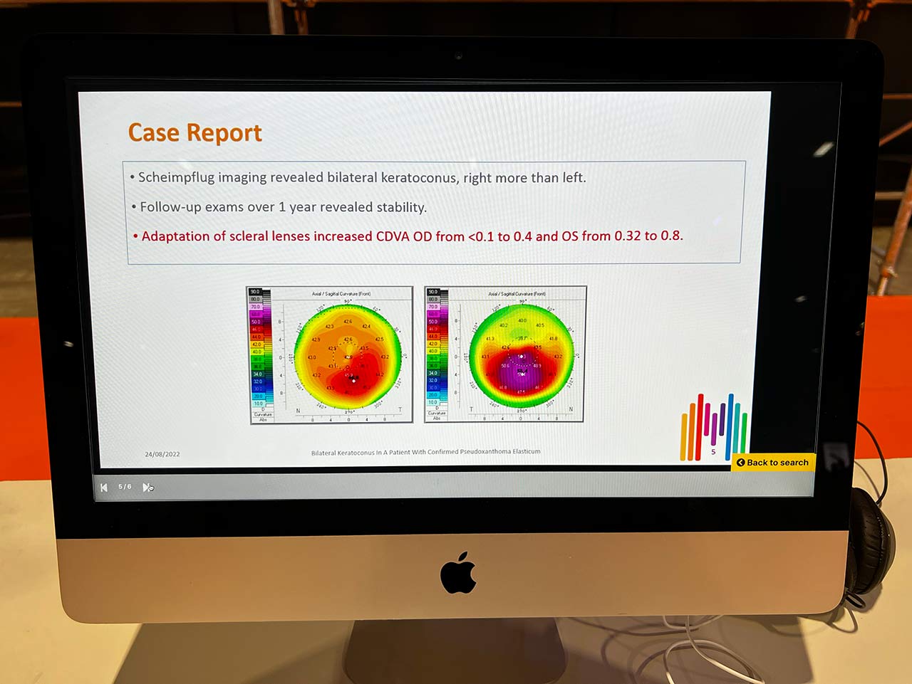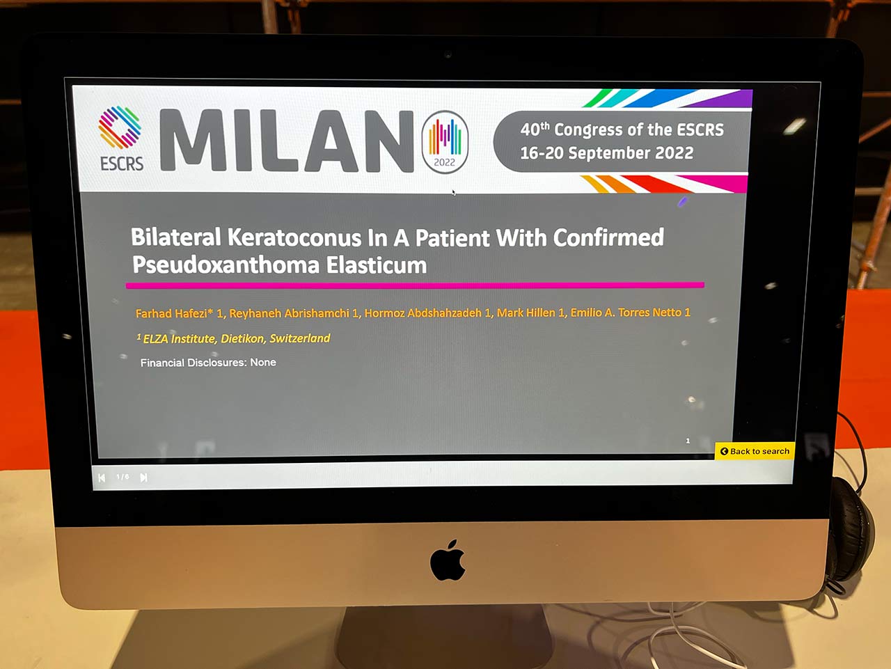 Prof. Hafezi and colleagues’ poster “Bilateral Keratoconus In A Patient With Confirmed Pseudoxanthoma Elasticum” was also presented today, in the on-demand poster area of the MiCo (Milan Congress Centre). This is the first description of both diseases being present in a person – but since both diseases are disorders of collagen structure in the eye, it may be that both diseases are linked. This suggests that ophthalmologists, if they find one pathology, should look for the other, and perhaps also that this will not be the first observation of this phenomenon.