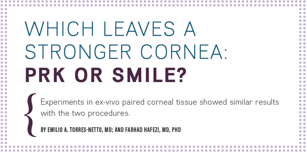 A lot has been said about SMILE, some of which has been about how, in theory, corneas treated with SMILE should be biomechanically stronger than LASIK-treated corneas (more of the stronger anterior stroma is left intact compared with physically cutting a flap there in LASIK and lifting it to perform ablation of the stroma underneath). But what about PRK? This is ablation of the anterior stroma after having just removed the epithelial cells above it, on the surface of the cornea. So the question remains: which is stronger? PRK or SMILE? The short answer is that PRK is stronger.