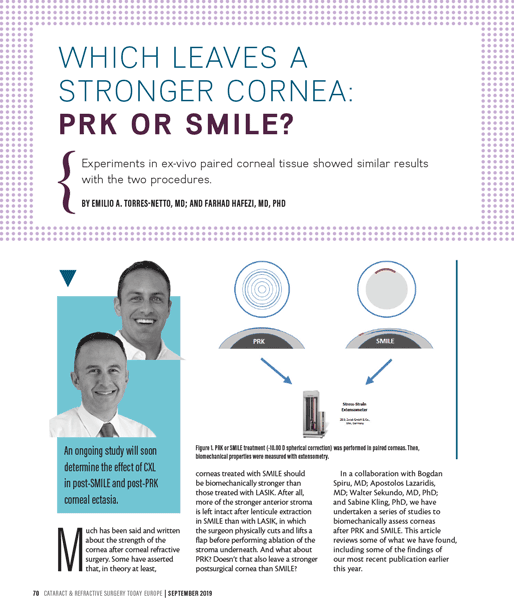 In a collaboration with Bogdan Spiru, Walter Sekundo and Sabine Kling, ELZA’s researchers have worked to biomechanically assess post-PRK, post-SMILE, cross-linked post-PRK and cross-linked post-SMILE corneas. ELZA’s Emilio Torres-Netto and Farhad Hafezi spoke to Cataract and Refractive Surgery Today Europe about their part in the research. Their results might surprise you.